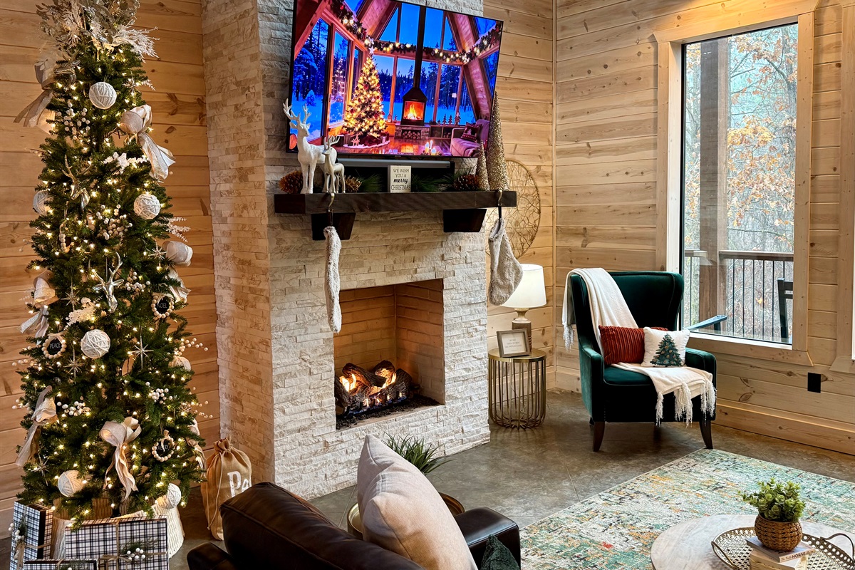 ★ Large deck with multiple seating areas, smart TV, outdoor speakers, fireplace, dining area & hot tub